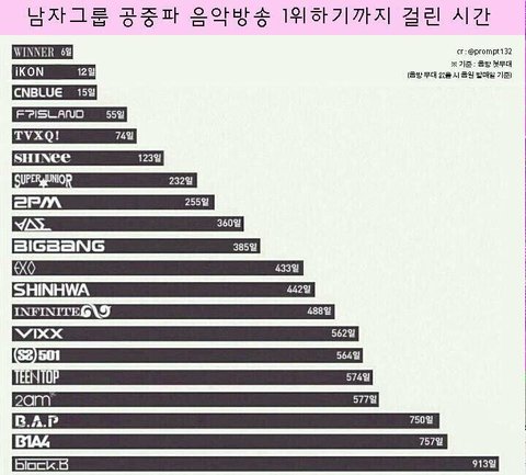 (The time it took for a boy group to win number one on a music broadcast. According to the first debut stage and goes by the debut day of first release [like a warm up single])
