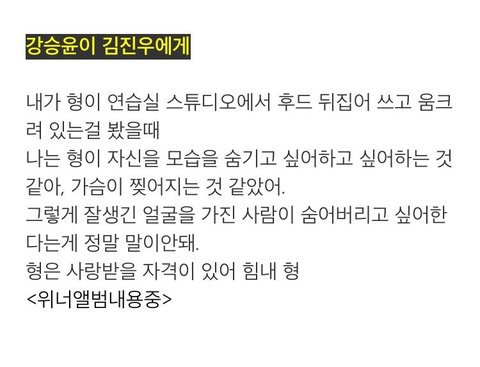 Kang Seungyoon to Kim Jinwoo: "When I saw you crouching in the practice studio hiding in your hood, it seemed to me like you wanted to hide yourself and my heart felt like it was tearing apart. It doesn't make sense that someone as good looking as you would want to hide away. Hyung, you deserve to be loved. Stay strong."