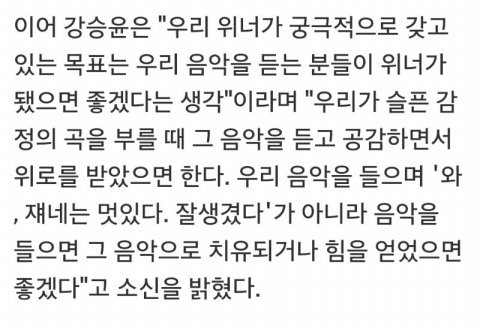 (trans) Kang Seungyoon "Our (Winner's) main goal is for the people who listen to our music to become winners as well... I hope that the sad feelings we express through our songs are relatable to the people listening, and can be of comfort to them. While listening to our songs, rather than thinking 'Wow, they're cool. They're good looking', I'd like the music to be healing and give people strength."