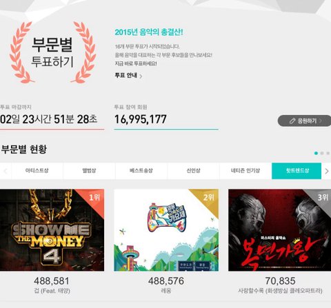 1. (+62, -0) What I find the most ridiculous is that it suddenly went from song vs song to program vs programㅋㅋ I'm not saying that the winner is ridiculous, and to change the winner, but I was voting for 'Fear', not the program 'Show Me the Money'ㅠㅅㅠ But looking at it now, I guess I was voting for 'Show Me the Money' and not 'Fear'....ㅋㅋ?